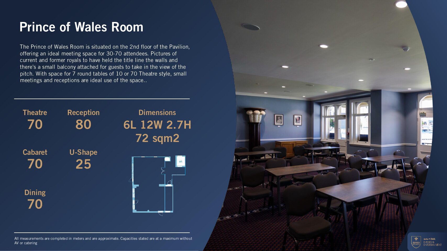 The Prince of Wales Room, named in honour of our longstanding Landlord whose family has leased the ground for over 175 years, is a distinguished and versatile space within the Kia Oval. The suite features a balcony with wooden benches, offering charming views across the iconic cricket pitch, creating a memorable backdrop for any occasion.