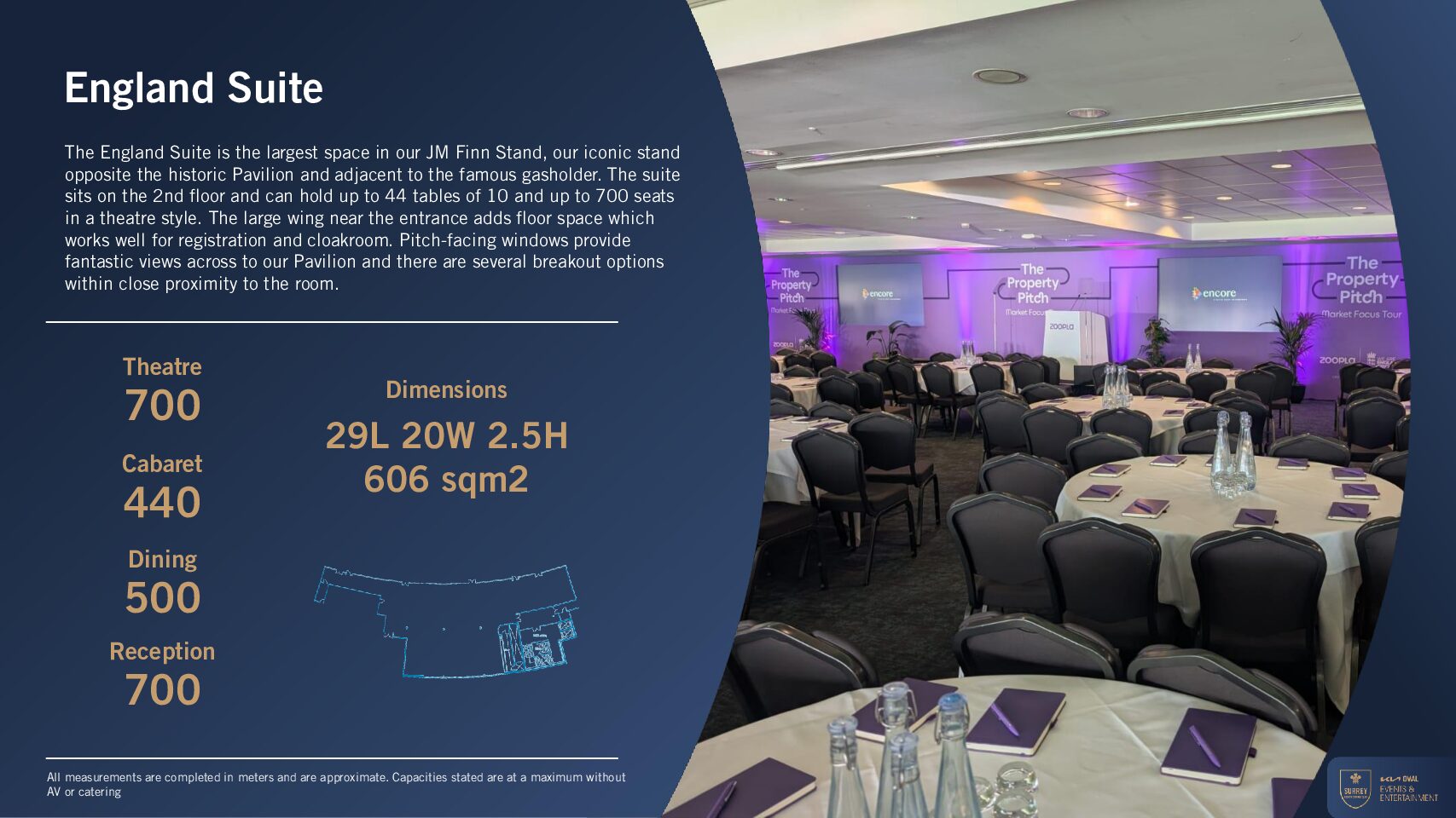 Located on the second floor, the suite sits directly above the Ashes Suite and is adjacent to a number of other flexible rooms, offering a wide range of breakout and support spaces to enhance your event. Combining functionality with striking views, it is one of the most adaptable and sought-after venues at the Kia Oval.