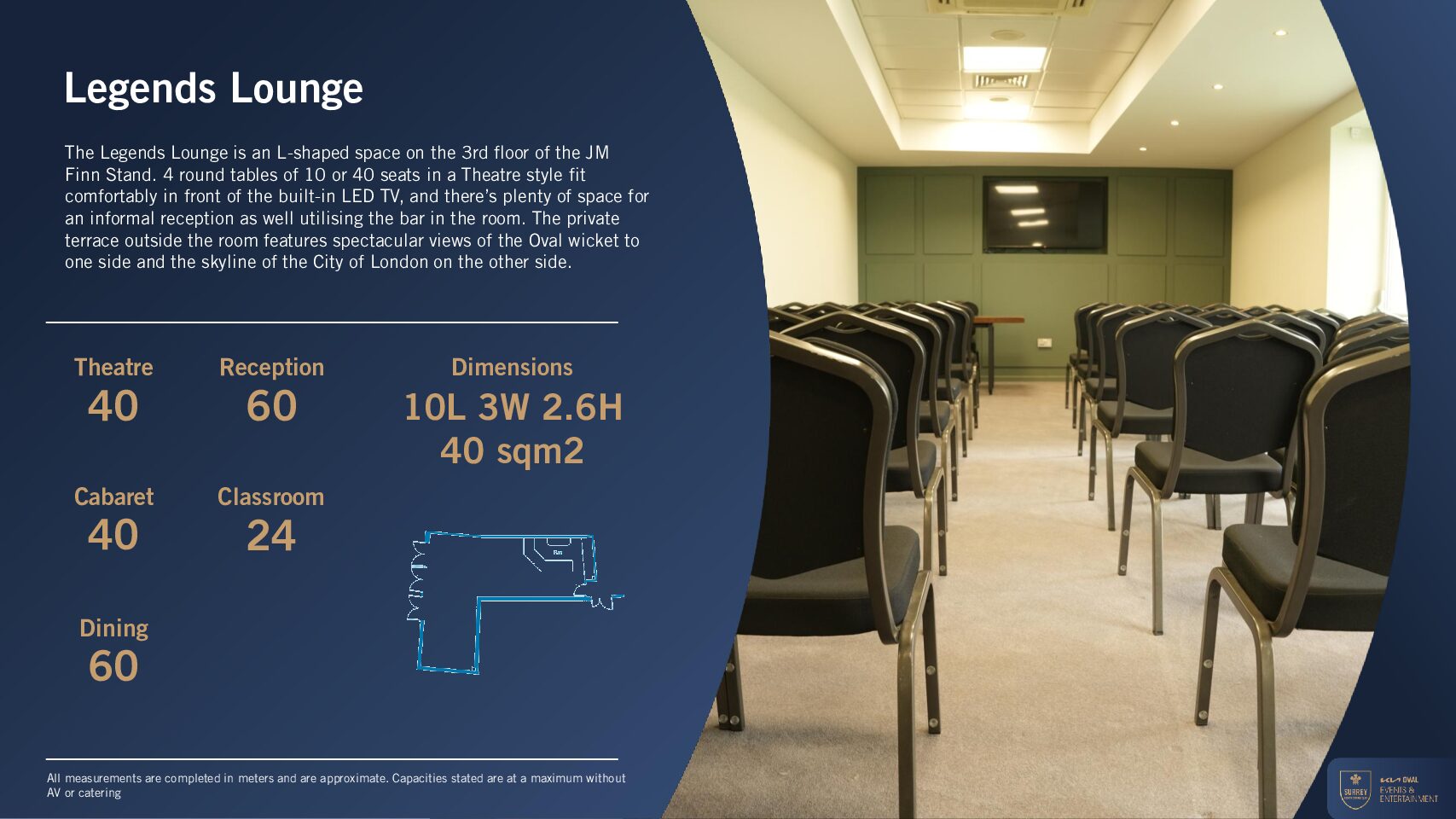 Blending exclusivity, flexibility, and stunning pitch-side perspectives, the Legends Lounge is a premium choice for organisers seeking an intimate and versatile space within the Kia Oval.