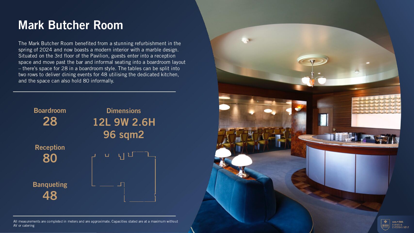 The Mark Butcher Room, located on the third floor of the historic Pavilion at the Kia Oval, offers a contemporary and versatile setting ideal for meetings, private dining, and corporate events. Following an impressive refurbishment in spring 2024, the room now features a beautifully modern interior, with elegant marble finishes, soft lighting, and refined detailing that create a polished yet welcoming atmosphere.
