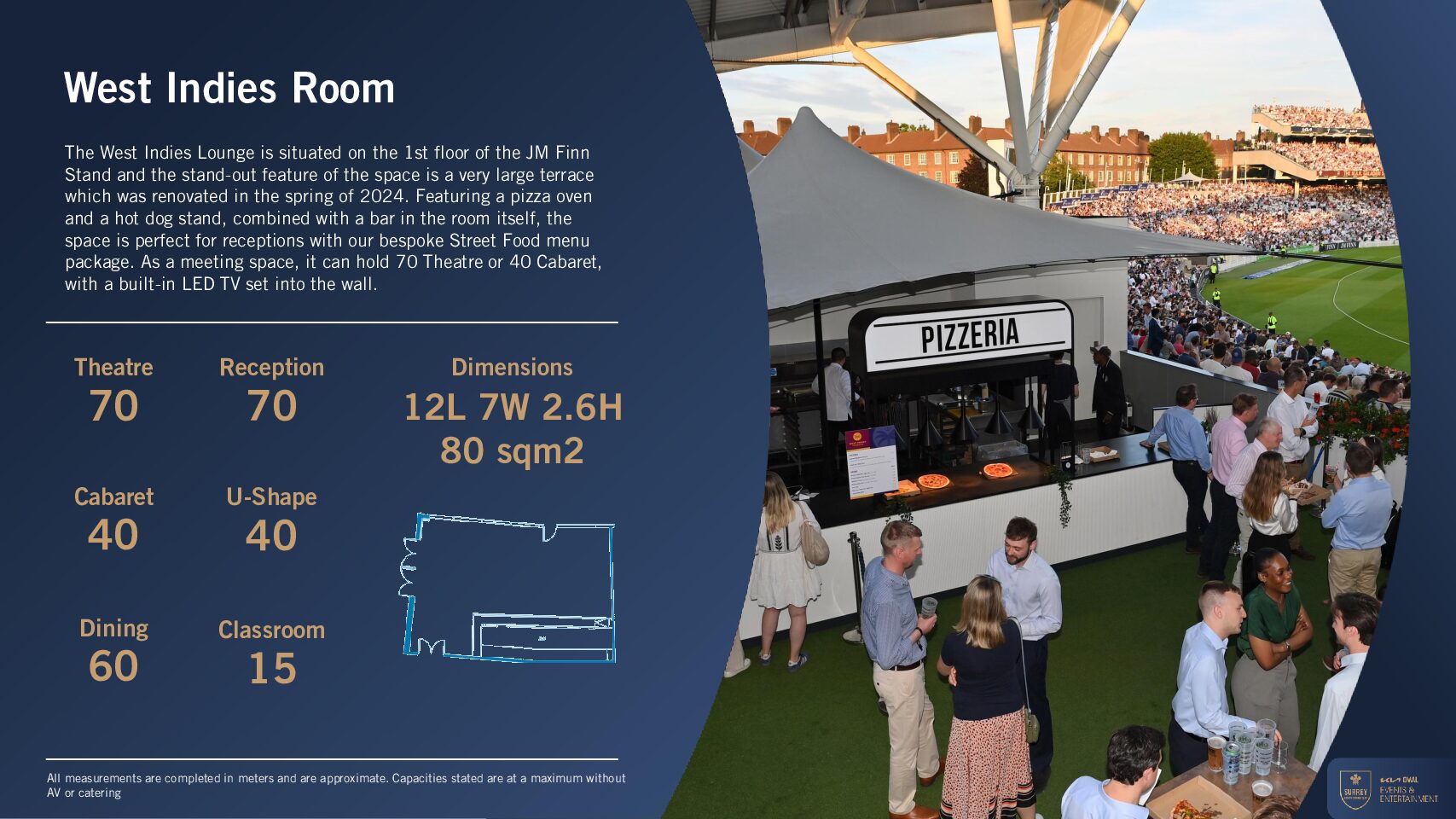 With its mix of contemporary facilities, flexible layout, and spectacular pitch-side views, the West Indies Room offers organisers a premium and memorable setting for intimate events at the Kia Oval.